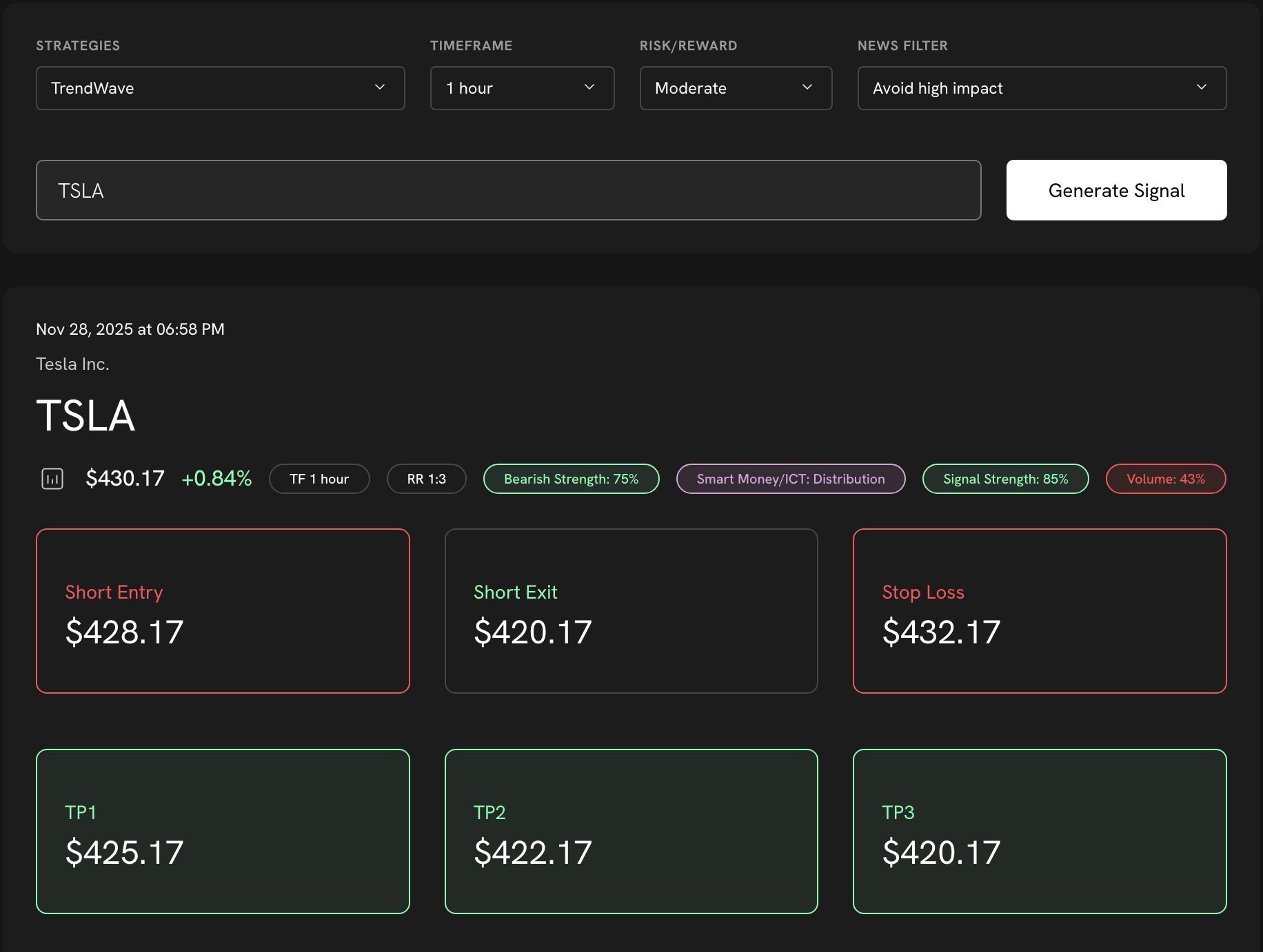 Simply enter your trading symbol or asset, and the AI generates a complete trading signal.